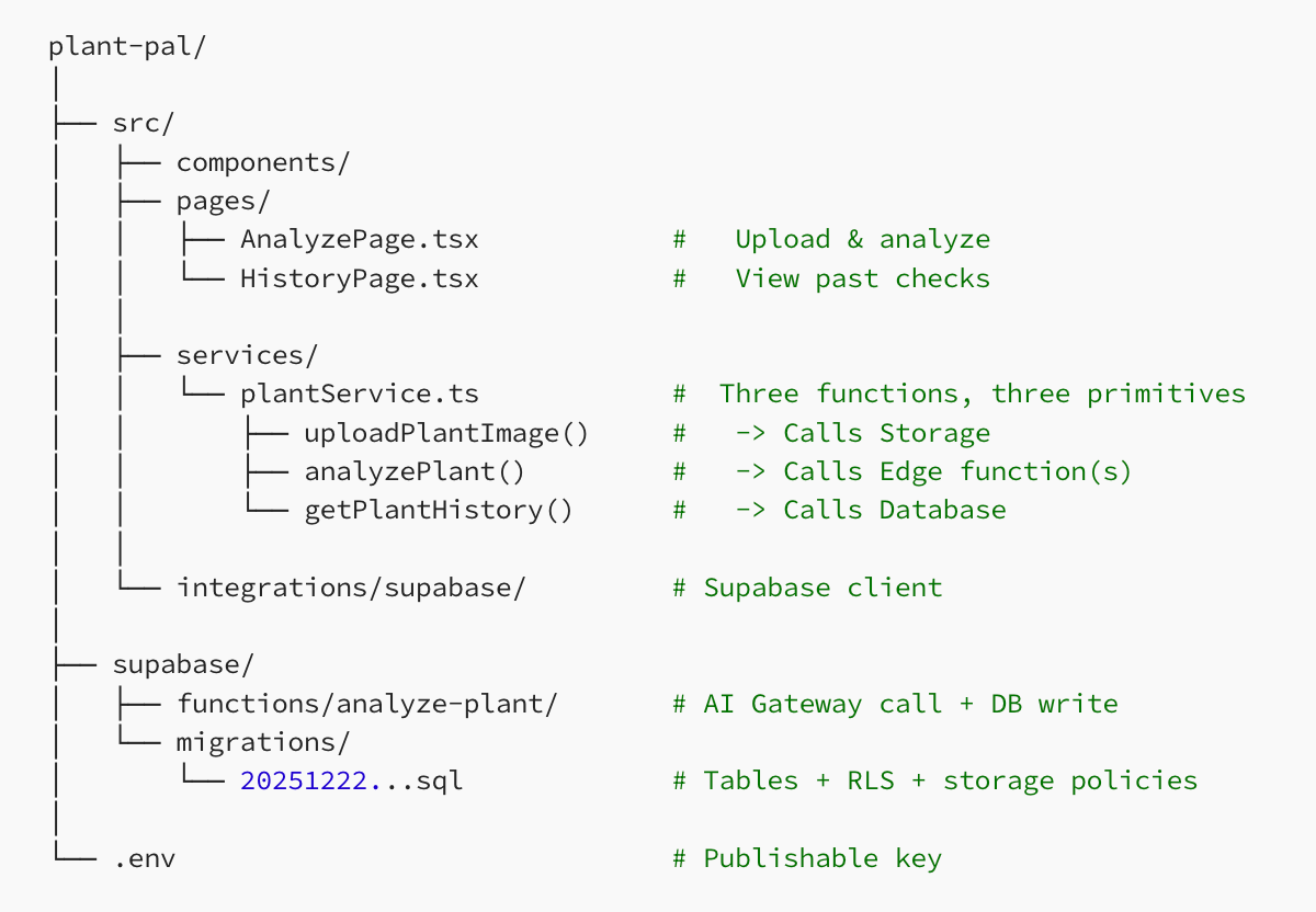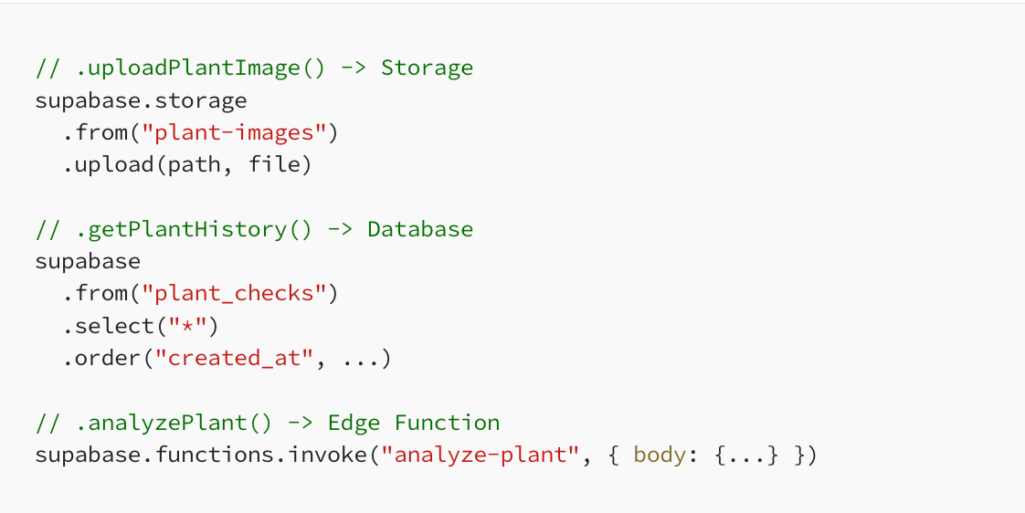 The frontend communicates directly to the Supabase primitives through a single shared client, defined in integrations/supabase. The service layer, plantService.ts , wraps this client and exposes clean functions to the frontend. In our case, each function maps cleanly to exactly one Supabase primitive: